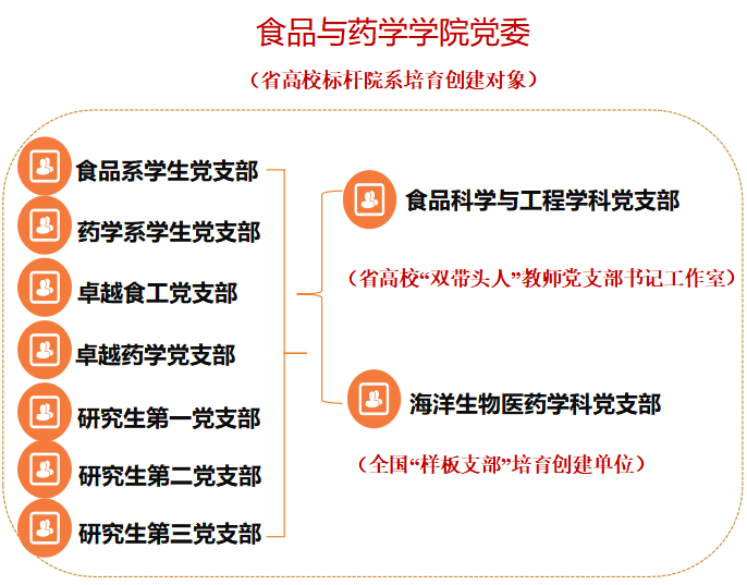 学院党委以“健康”为核心,以食品和药学两大专业方向为两翼,围绕“健康中国”和“海洋强国”两大战略使命,坚持政治建设为统领,高树标杆、高设标准,把党建工作与人才培养、学科建设、科研创新、社会服务同谋划、同部署、同推进,突出旗帜引领,立足专业优势,筑强战斗堡垒,扎实发挥党建引领作用。