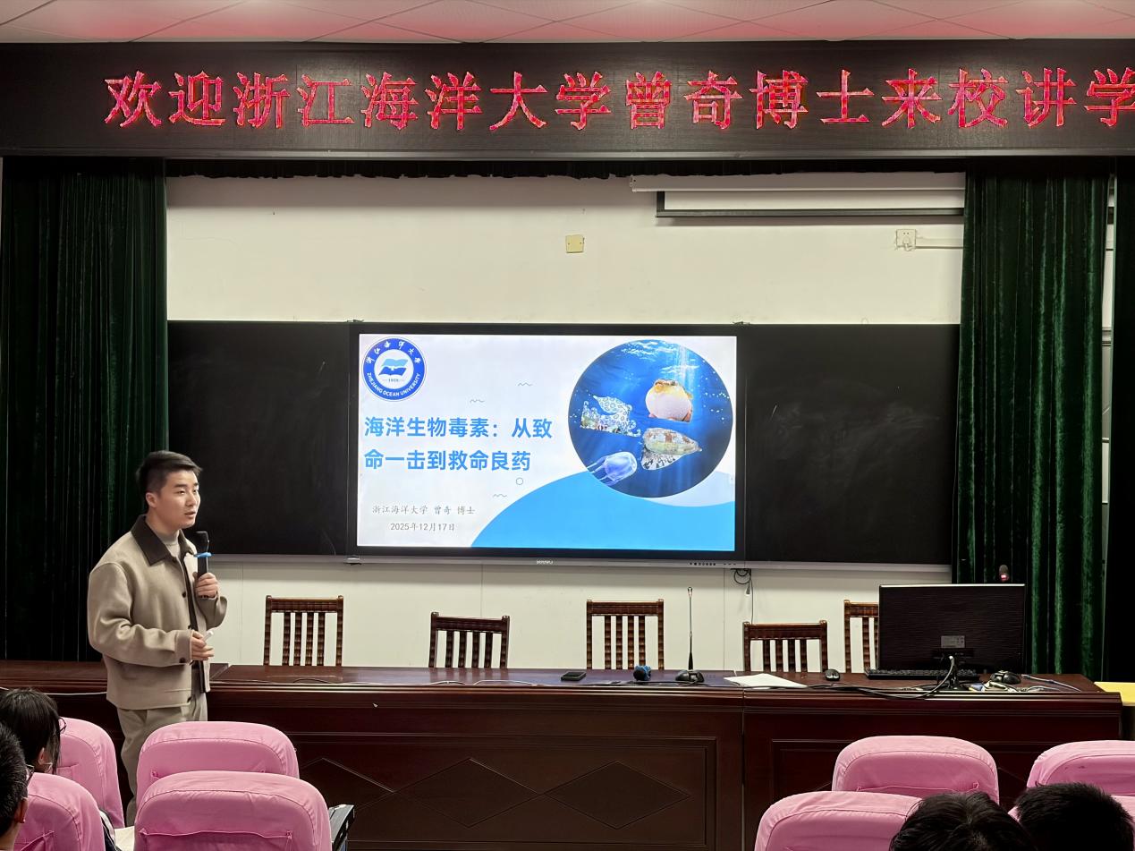 为了让青少年近距离感受海洋科学魅力、了解91暗网 的学科特色,2025年12月17日,91暗网 走进黄岩中学,由曾奇博士开展了题为“海洋生物毒素:从致命一击到救命良药”的科普讲座。两百余名师生到场聆听,开启了一场探索海洋“毒”世界的奇妙之旅。