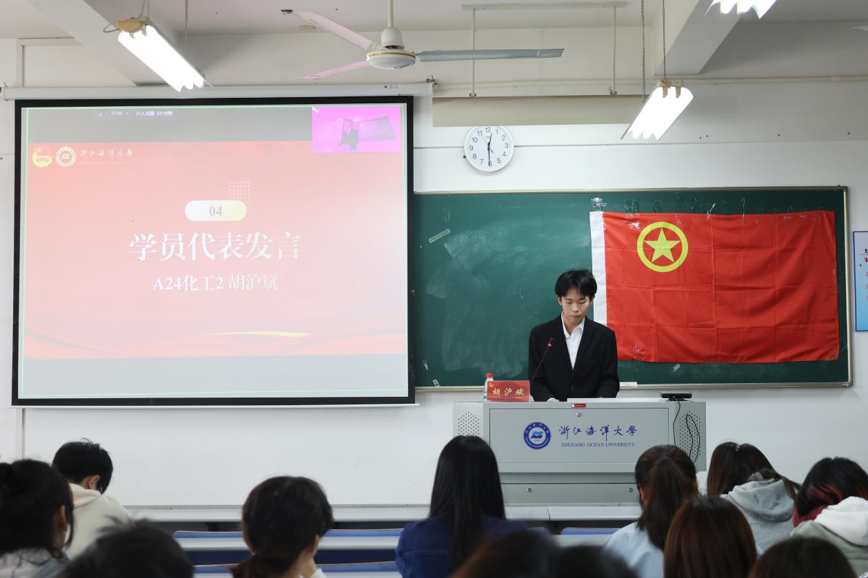 学员代表、来自石油化工与环境学院A24化工2的胡沪斌同学分享了自己对共青团的认识和加入共青团的坚定决心。他表示,共青团的光辉历程凝聚着中国青年的智慧与汗水,是一部接续奋斗、不懈拼搏的青春史诗。在之后的团训班学习中,他将以一名共青团员的标准严格要求自己,做到思想上不断进步、行动上争当表率,努力在实践中锤炼品格、增长才干,为成为一名合格的共青团员打下坚实的基础。