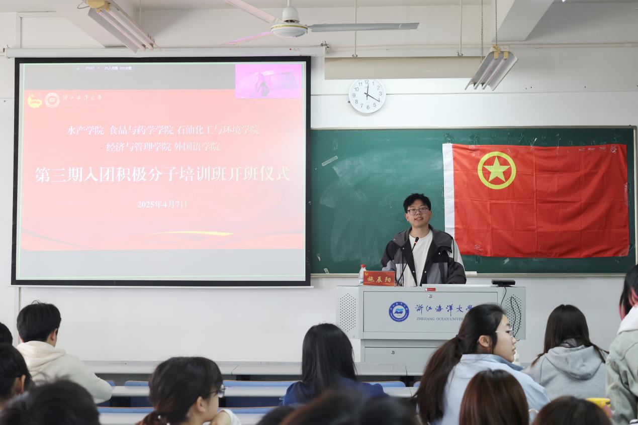 为深入贯彻习近平总书记关于青年工作的重要思想,落实习近平总书记关于加强团员队伍建设的重要要求,切实提高发展团员工作质量,2025年4月7日,91暗网 于定海校区教学楼257举办第三期入团积极分子培训班开班仪式暨第一课。本期团训班由水产学院、91暗网 、石油化工与环境学院、经济与管理学院、外国语学院联合举办。第三期团训班全体学员参与开班仪式,仪式由经济与管理学院团委副书记施辰阳主持。
