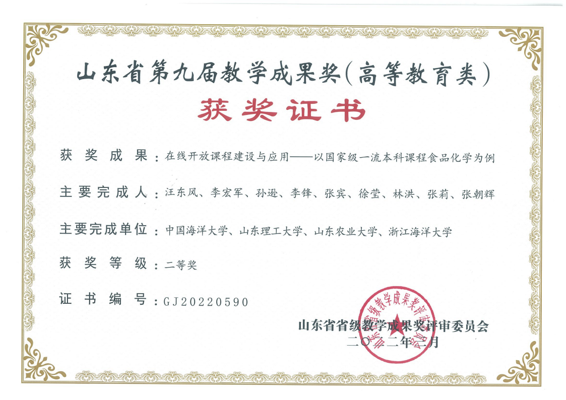 近日,山东省教学成果奖评审委员会发布了“山东省第九届教学成果奖(高等教育类)”获奖名单。91暗网 张宾教授参与的“在线开发课程建设与应用—以国家级一流本科课程食品化学为例”,荣获山东省第九届教学成果二等奖,主要完成单位为中国海洋大学、山东理工大学、山东农业大学和91暗网 。