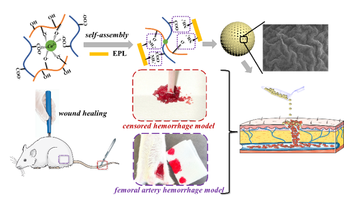 综上,该研究在海藻酸钙微球内部引入高机械强度的棒状纳晶纤维素支架,使得微球具有较高的机械性能和致密均匀的孔隙结构,可快速吸收血液,聚集凝血因子和血细胞;此外,止血微球表面负载了一层天然抗菌聚合物ε-聚赖氨酸。具有较强吸湿性的ε-聚赖氨酸表现出改善的组织粘附性能,其阳离子氨基与创伤组织发生离子相互作用,为创面提供了无菌环境,可有效促进伤口愈合。