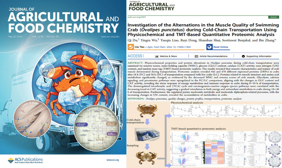 杜琪博士生等以细点圆趾蟹为研究对象,运用分子生物学结合TMT定量蛋白质组学技术,探究了0~36h冷链运输过程中,蟹机体生理反应及其肌肉品质特性变化过程,揭示了冷链、氨氮及低氧胁迫等对细点圆趾蟹食用品质及肌肉蛋白质功能的影响机制,解析了细点圆趾蟹冷链运输过程中的机体代谢变化过程,为实时监控和评估其肌肉品质特性提供参考依据,也为活蟹冷链物流调控技术优化提供理论基础(DOI:10.1021/acs.jafc.4c02224)。