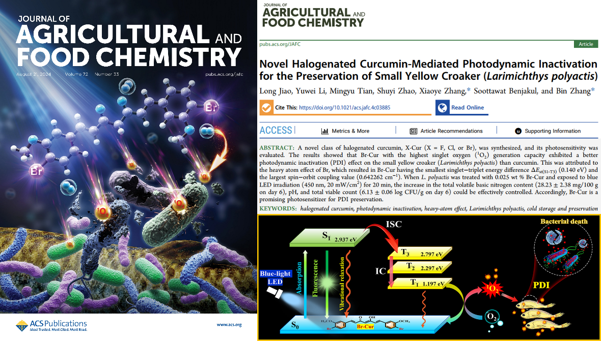 焦龙博士等创制了一种新型的卤代姜黄素光敏剂(Br-Cur),将其应用于冰鲜小黄鱼的贮藏保鲜中,结果显示出良好的保鲜效果及应用潜力。这种基于光动力的杀菌灭活技术,不仅显著保持了冰鲜小黄鱼的贮藏品质,还有效规避了传统化学防腐带来的潜在风险,为冰鲜水产品保鲜技术发展提供了一种更安全更环保的解决方案(DOI:10.1021/acs.jafc.4c03885)。