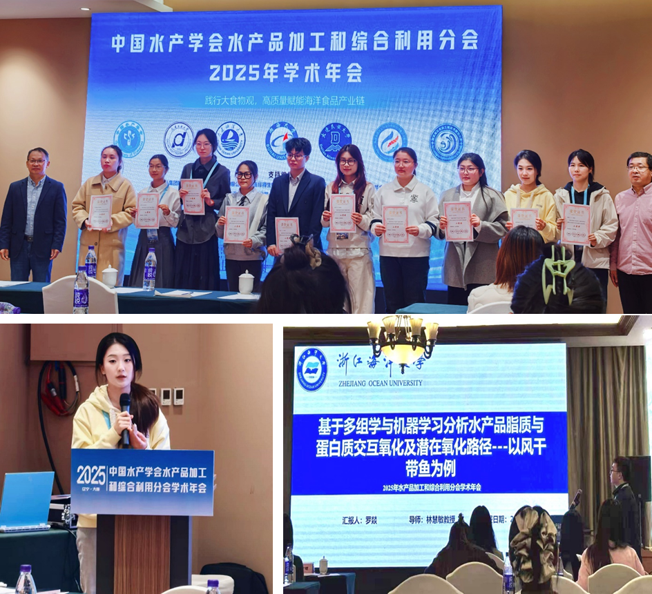 本次年会设置了院士报告、大会特邀报告、专题报告及研究生论坛等多个环节。我院师生积极参与、教学相长。在研究生论坛中,我院罗燚同学凭借《基于多组学与机器学习分析水产品脂质与蛋白质交互氧化及潜在氧化路径—以风干带鱼为例》荣获报告一等奖;魏然同学的《新型姜黄素衍生物的光动力灭活保鲜应用》荣获报告二等奖,充分彰显了我院研究生在水产品加工领域的科研活力与创新潜力。