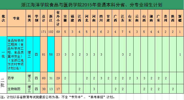 浙江海洋学院2015年分省、分专业招生计划