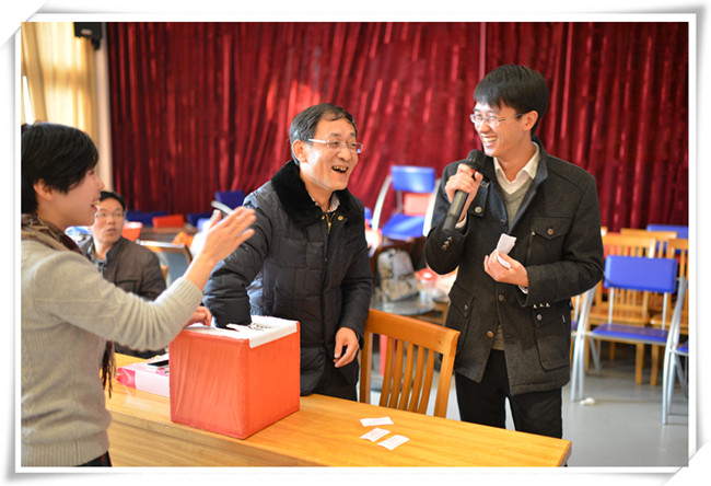 联欢会在药学系工会小组的集体合唱“歌声与微笑”拉开序幕,党委书记张宏波一曲《谢谢你的爱》男声独唱将联欢会推向高潮,伴随着抽奖和猜谜语活动,15名教职工获得谜语奖励,5名教职工获2014年最幸运教职工奖;邓尚贵、罗宏宇、方旭波、彭舟、陈荫等12名教师表演了个人及两人节目;食品系工会小组的合唱《我的未来不是梦》,代表未来梦想的憧憬,行政与化学小组带来的“三句半”《话说学工》,引得满堂笑语。
