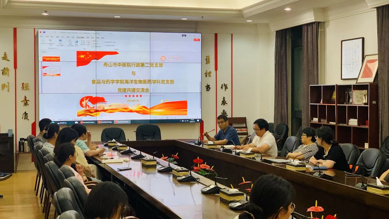 为深入贯彻落实党的二十大精神,积极探索基层党建工作新模式,推动高校党组织与地方医院党组织建立“党建共同体”,有效发挥学校和医院专业资源的互补优势,2024年7月2日18点,舟山市中医院行政第二党支部书记谢琼与全国党建工作样板支部-海洋生物医药学科党支部在学校行政楼4号会议室举办了一场主题为“党建共建促发展”的交流会。本次会议旨在通过党建共建活动,进一步加强双方党组织的交流合作,促进党建工作与科研工作的融合发展。