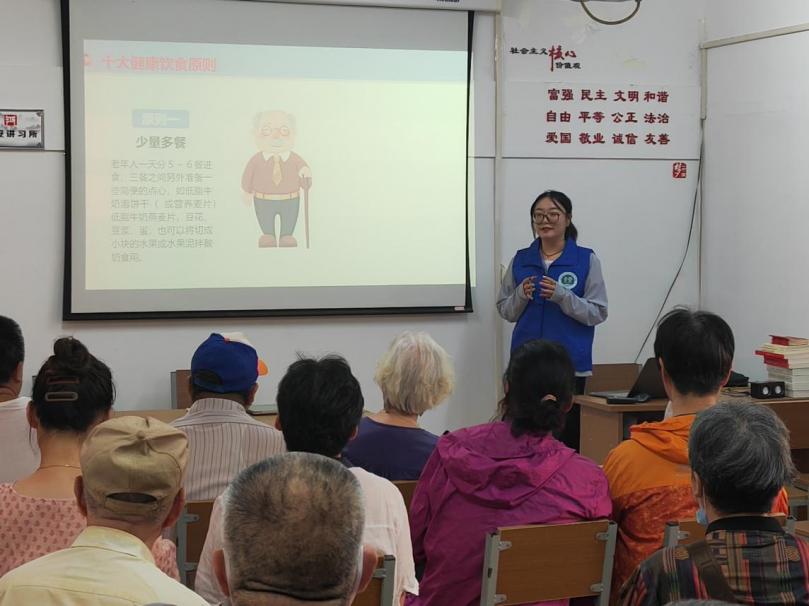 研究生第一党支部徐婕同学从老年人的饮食、睡眠、运动、养生等四个方面,向老年人详细讲解了有关合理膳食及科学养生的相关知识。同时还与老年人进行互动,解答老年人的健康疑问,分享保健心得。并号召老年居民平时应多注意体检保健,提高健康意识,倡导全民关注老年人健康,促进家庭成员树立健康理念。