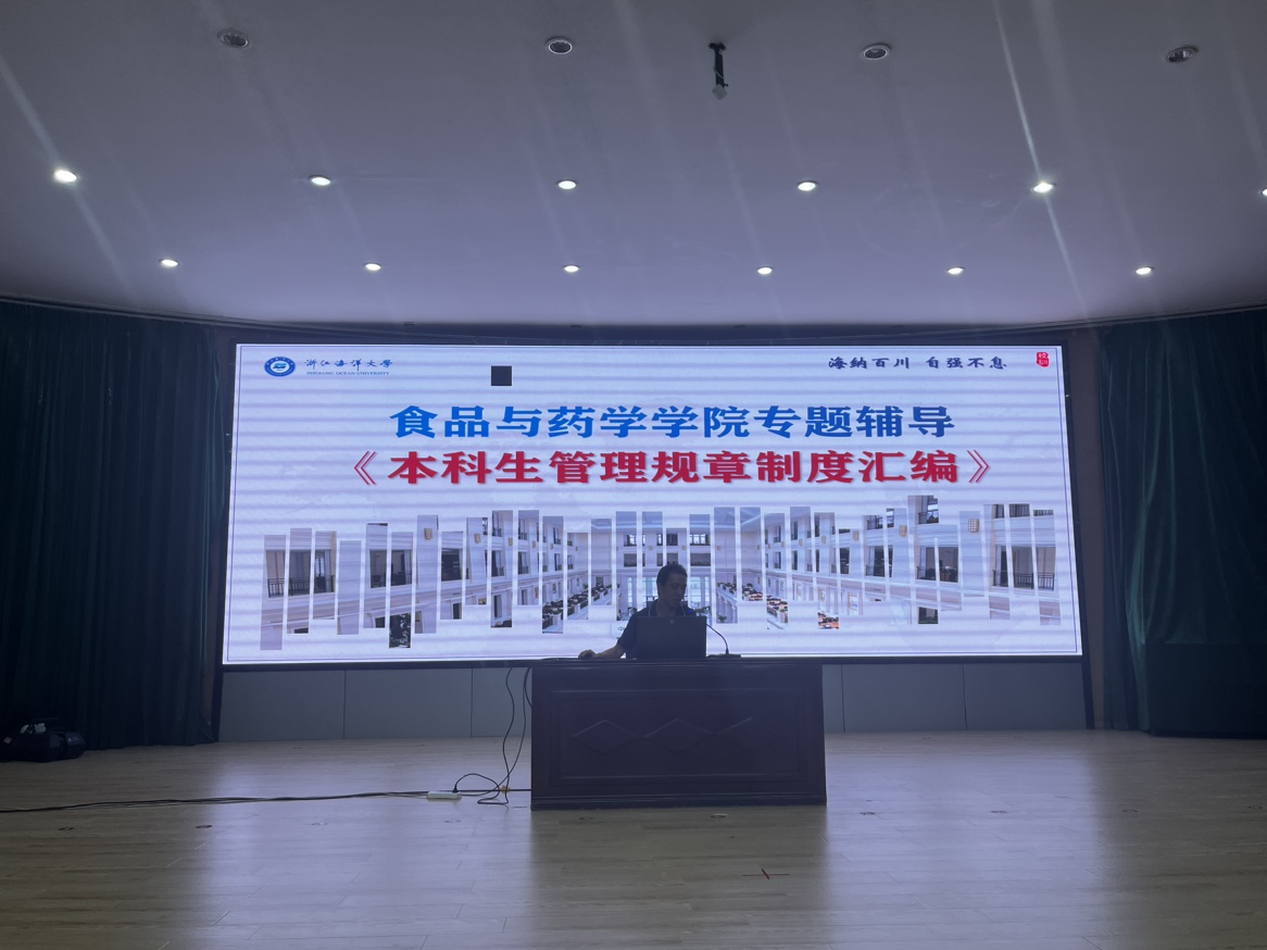 会上,学工办主任付宗国为新生们讲解了《本科生管理规章制度汇编》,从学籍管理、宿舍管理、评价评优、资助政策、违纪处分、团青思想、创新创业等做了详细介绍,引导学生学会使用学生手册,做遵纪守法、积极向上的食药青年。