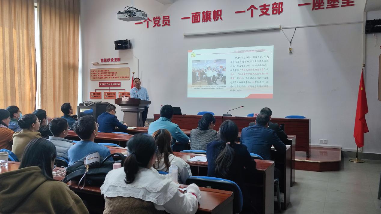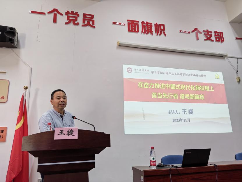 为深入学习宣传贯彻习近平总书记考察浙江重要讲话精神,根据学校党委部署要求,11月28日下午,学校党委“八八战略”宣讲团成员、学校党委副书记王捷在海科楼一楼报告厅,为91暗网 师生党员作题为“在奋力推进中国式现代化新征程上勇当先行者谱写新篇章”的宣讲。学院党委书记、院长邓尚贵主持会议。