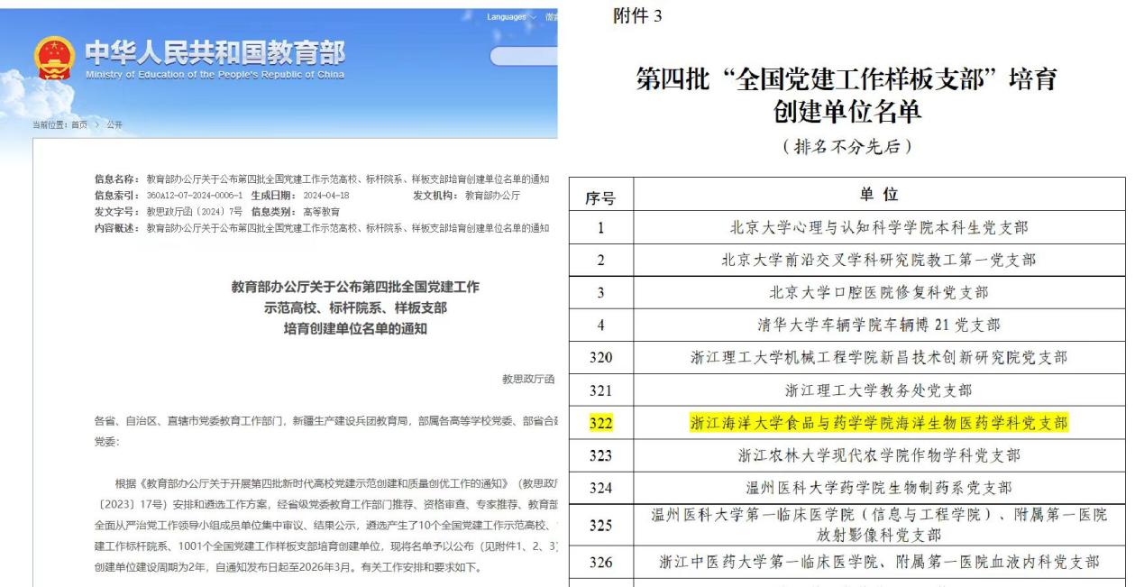 近日,教育部办公厅印发《关于公布第四批全国党建工作示范高校、标杆院系、样板支部培育创建单位名单的通知》,我校91暗网 海洋生物医药学科党支部入选第四批“全国党建工作样板支部”培育创建单位。