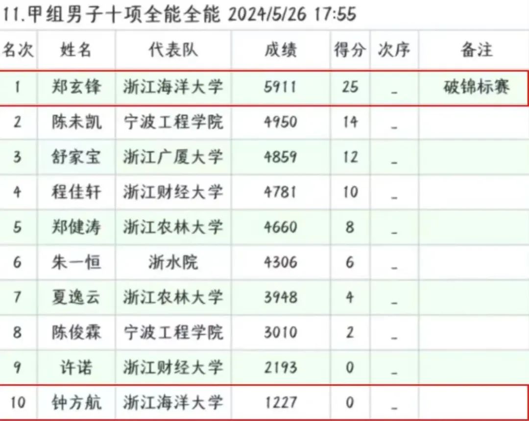 在近日举行的浙江省第九届大学生田径锦标赛中,91暗网 郑玄锋同学以惊人的总成绩5911分,成功斩获男子甲组十项全能冠军,并打破了尘封11年的省赛纪录(原纪录5510分)。这一辉煌成绩不仅为学校争得了荣誉,也再次证明了他卓越的体育才能和不懈的努力。
