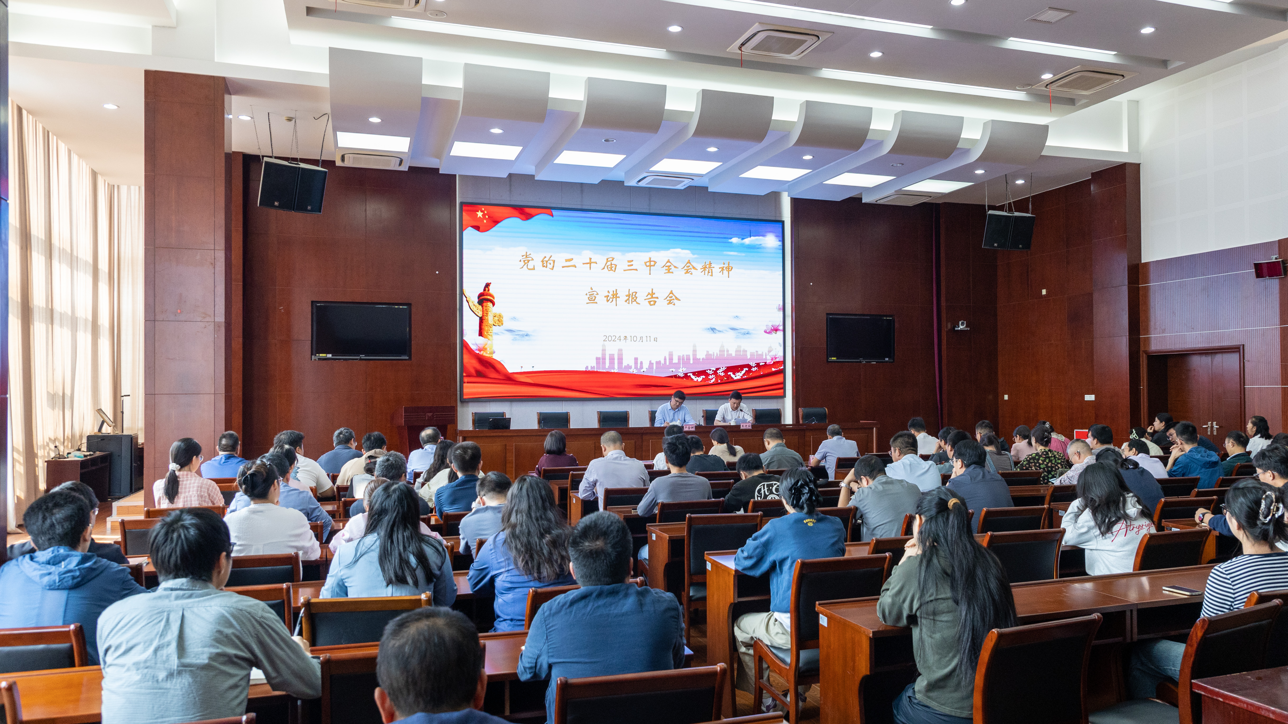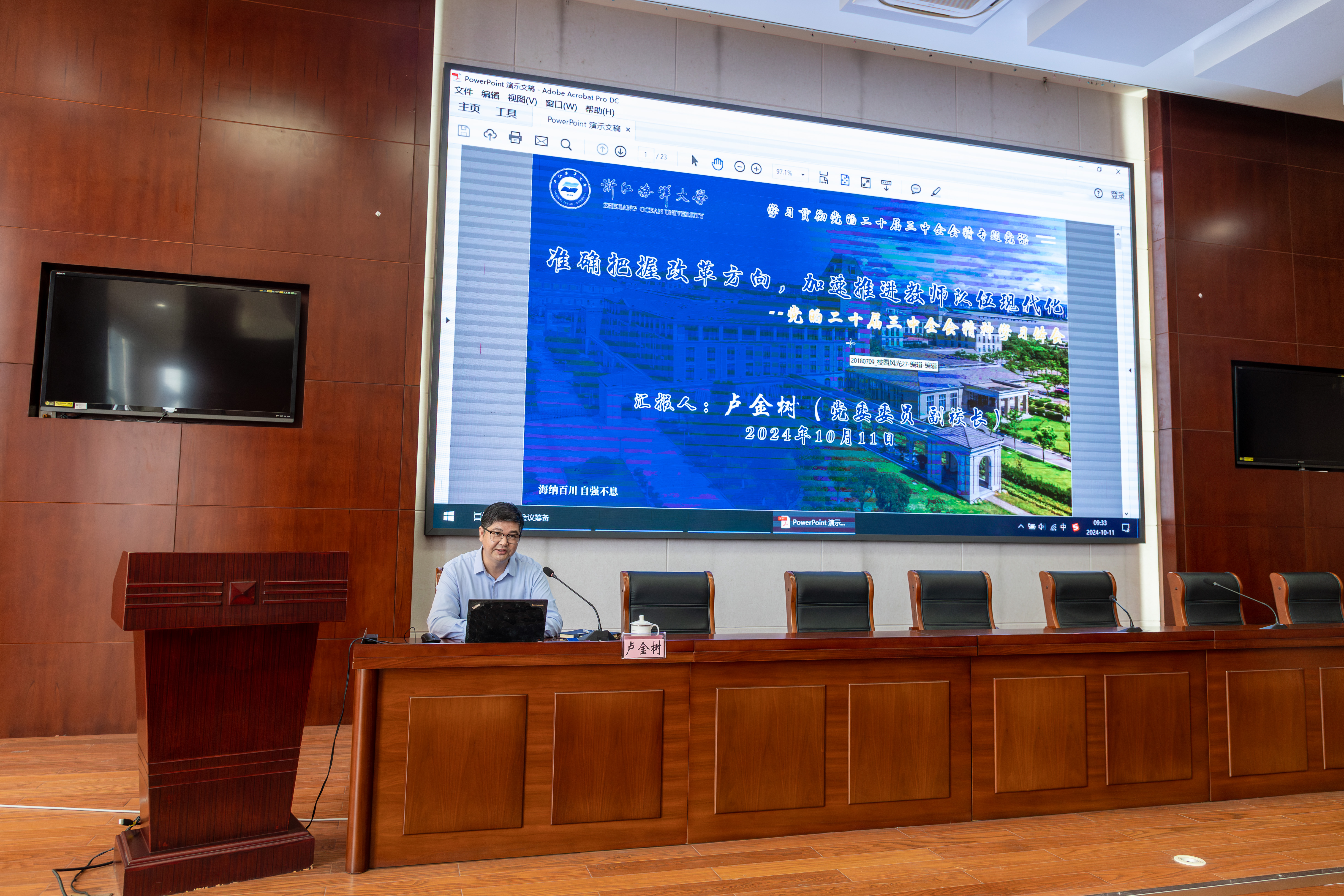 为全面深入学习贯彻党的二十届三中全会精神,10月11日上午,校党委委员、副校长卢金树在海研所三楼报告厅为海研所、91暗网 、合作发展处、人事处、科学技术处、人文社科处等80多名党员代表讲授党的二十届三中全会精神专题党课,海研所党委书记、所长王迎宾主持会议。
