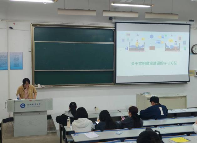 培训会采用"现场互动 知识问答"形式,针对突发应急类、心理支持类、纪律规范类等典型案例开展互动研讨。在"文明寝室建设经验分享"环节,文明寝室代表吴海洲同学分享了文明寝室建设的“N 1”种方法,创新提出“1种核心方法”即为“团结一心”,从朋辈的角度分享宿舍生活的感悟,为各位寝室长提供了优秀的学习范本。