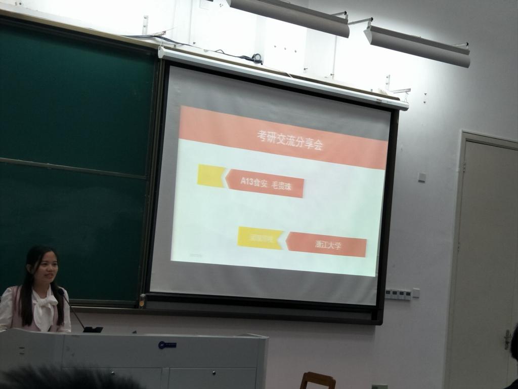 分享会于晚上18:30准时开始。观众席坐满了对此次分享会充满兴趣的同学。首先分享经验的是来自A13食工已成功被南京农林业大学录取的施姿鹤同学。之后,叶佳杰同学(浙江工业大学)、曹逸同学(江南大学)、徐兑悦同学(中国药科大学)、毛贵珠同学(浙江大学)等几位同学先后上台分享了考研过程中的经验与体会,并给学弟学妹们加油打劲。几位同学分享完考研经验后,就是期待已久的提问环节,观众席的同学积极举手提问,并得到了想要的答案和帮助。分享会最后,由虞书记总结陈词,并鼓励有意向考研的同学继续努力。分享会在热烈的掌声中结束。