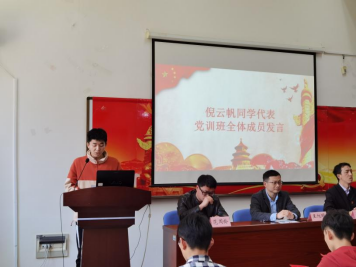 A19食安班倪云帆同学作为第二期党训班学员进行发言。他表达了对于能够参与党训班的培训和学习、能够向着党旗更近一步的自豪。他呼吁全体学员端正入党动机,认真学习和宣传党的方针,党员的标准要求自己,保持先进性。此外,他代表全体成员郑重宣誓:珍惜这来之不易的机会,遵守党训课的纪律,保质保量完成任务,争做优秀学员。