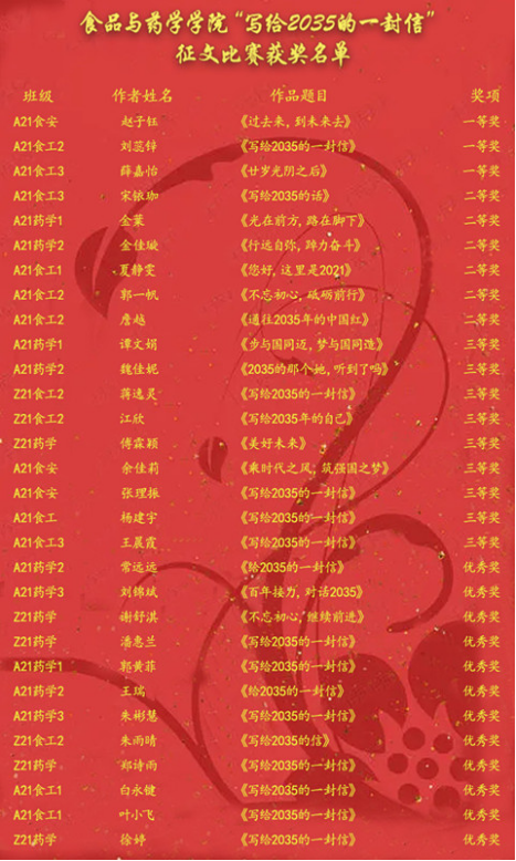 为深入学习宣传贯彻习近平总书记“七一”重要讲话精神,紧紧围绕铭记伟大奋斗历程、弘扬伟大建党精神、把握历史经验启示,持续深化党史学习教育和“四史”宣传教育,激发广大青年追求远大的理想,增强历史使命感和社会责任感。2021年9月,食药学院团委面向21级本科生开展以“写给2035的一封信”为主题的征文活动。引导广大青年畅想祖国的繁荣富强、家乡的发展变化和个人的幸福生活,争做担当民族复兴大任的时代新人。