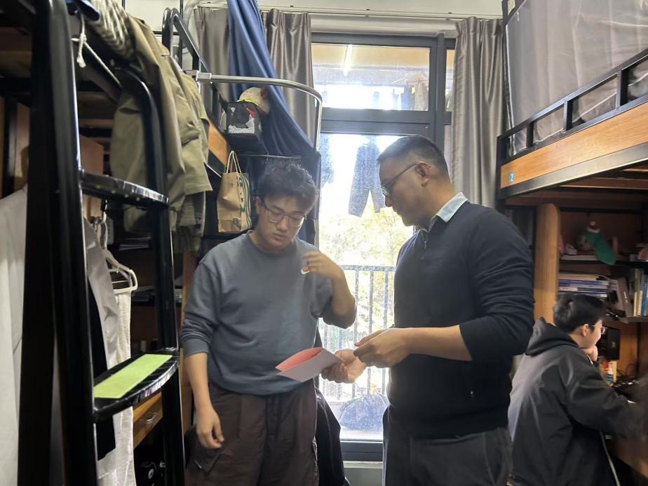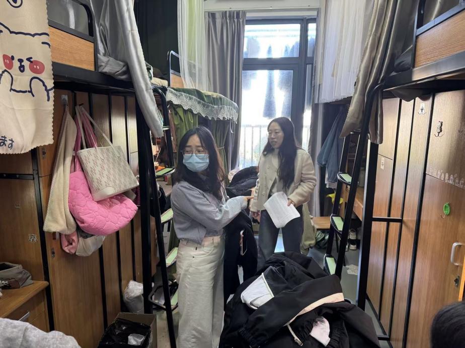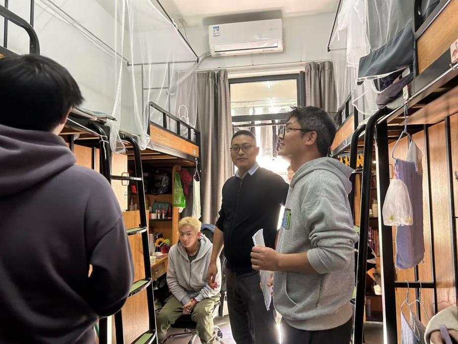 走访过程中,陈荫老师详细询问了学生的学习进度、课程适应情况,以及在学习中遇到的困难与问题,并给予了耐心的解答与指导。同时,他还细心了解了同学们的寝室生活状况,包括住宿环境、作息习惯等,强调了宿舍安全、卫生和文明的重要性,提醒学生们要保持良好的生活习惯,共同营造一个温馨、和谐、安全的住宿环境。