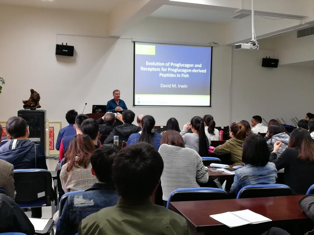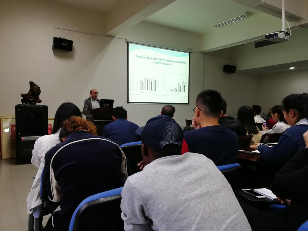 David Irwin教授带来的是题为“Evolution of proglucagon and receptors for proglucagon-derived peptides in fish”的报告,Santiago Aubourg教授做了题为“Employment of jumbo squid (Dosidicus gigas) skinfor the quality enhancement of fish”的研究报告。