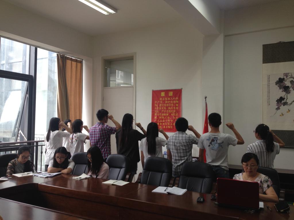 2015年7月1日,食医学院在海科楼228室举行入党宣誓仪式,11名新入党党员面对党旗庄严宣誓。学院党委书记张宏波、学生党支部书记、党员代表和入党积极分子共40余人参加,宣誓仪式由学院党委组织委员杨最素主持。