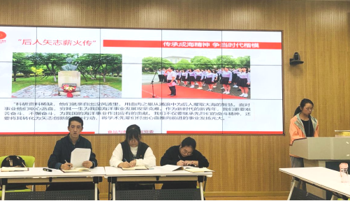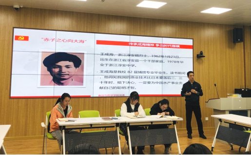 会上,支部书记付宗国介绍了王成海烈士的生平事迹:王成海是我校 82 届捕捞专业毕业生,在大学读书期间,王成海学习刻苦努力,成绩名列前茅。当他得知我国的渔业技术比日本起码要落后二、三十年时,暗下决心,一定要为中国渔业水产事业赶上发达国家而贡献自己的聪明才智。毕业后王成海考取了国家教育部公派赴日本出国留学。在日期间,他以出色的业绩完成学业,获得博士学位,并谢绝了国外的高薪聘请,毅然回国从事科教工作。1991年10月22日,年仅29岁的王成海在科学考察时,为营救潜水遇险同事,献出了宝贵的生命。