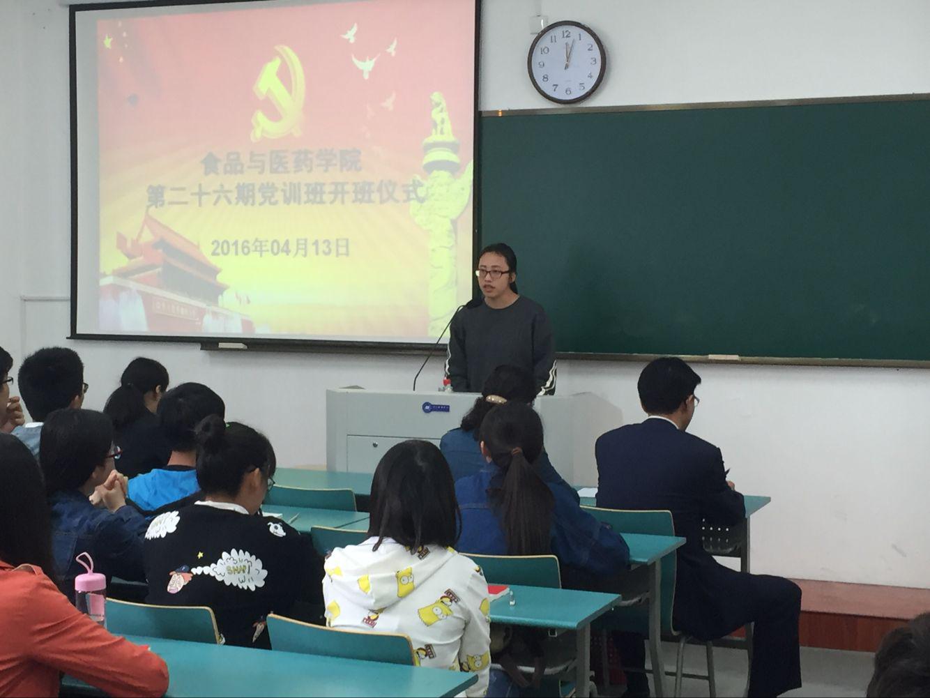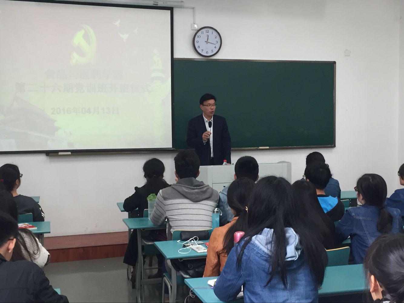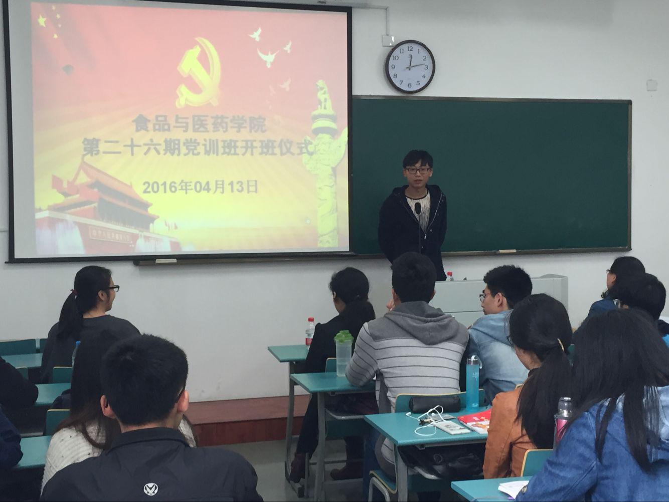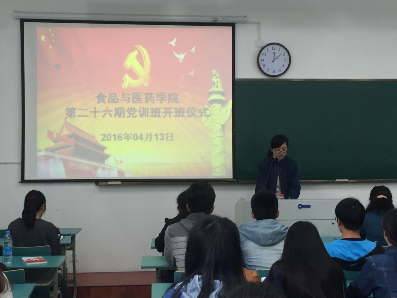 2016年4月13日中午,中共浙江海洋大学食品与医药学院委员会学生党校第二十六期党训班开班典礼在公共教学楼129举行。学院党委书记张宏波出席开班典礼,学院党委组织委员杨最素,学生第一党支部书记胡细华、学生第二党支部书记王琳玲、研究生党支部书记缪文华、学院分团委负责人蒋雅美和31名党训课学员参加。