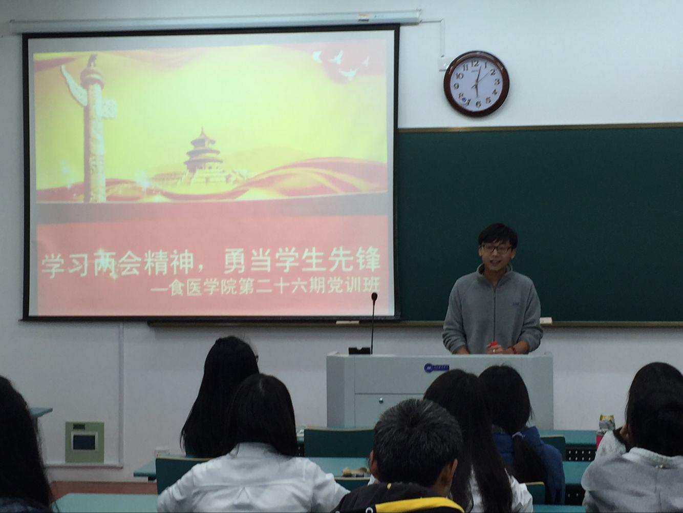 2016年4月17,食品与医药学院在公共教学楼127组织两会专题学习讨论会。本次学习讨论会由食医学院团学负责人蒋雅美老师组织召开,党训班班长A13食工班陈俊羽主持,学院第二十六期党训班全体学员共同参与。