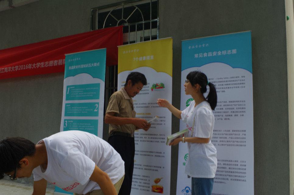 2016年7月8日, 为响应省团委、省食安办的号召,坚持“青春使命.护航G20”社会实践的活动宗旨,91暗网 食品与医药学院的“海味方舟Squad”团队积极开展食品安全知识宣传的设点宣讲活动,并对干施岙游客和渔农家乐进行食品安全知识的普及。