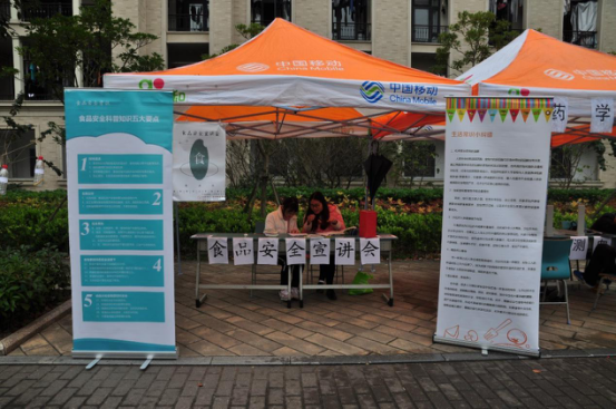 早在活动前一天,学院微信公众号上就推送了关于食品安全的文章,介绍了一些食品安全知识,并且推荐给了有兴趣的同学关注了解,拉开了食品安全宣讲会的序幕。4日早上8点,志愿者们带着活动所需物品来到莲池设点,并在设点帐篷外放置了食品安全知识的易拉宝,向同学们讲解上面的内容,并且分发食品安全手册,正式吹响了食品安全宣讲会的号角。