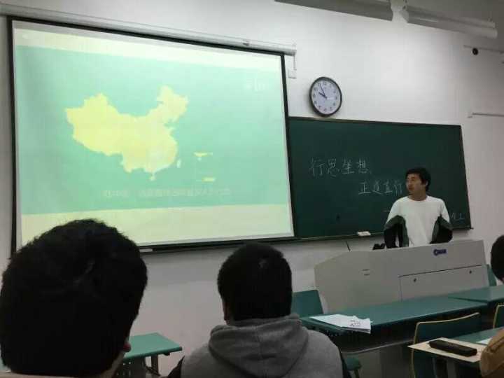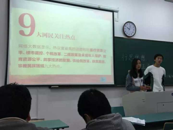 上午9点50分,团日活动正式开始。团支书陈柔含主持、宣传委员李成恩辅助主持了这次团日活动。在第一个环节,陈柔含同学简单做了开场,并由李成恩同学向我们介绍了2017年两会的热点聚焦,从“1-9”九个数字,解读两会九大热点问题,其中也包括很多民生问题,部长通道的发展通达民心,同学们听讲得十分认真。
