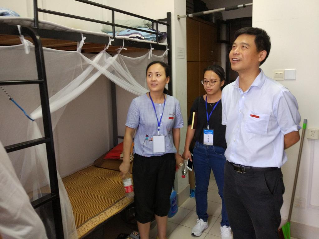 2017年9月15日15时,学院党委副书记虞浩臣和辅导员蒋雅美、王琳玲以及新生班主任一同走访了学院2017级新生寝室,亲切地询问了新生的入住情况。