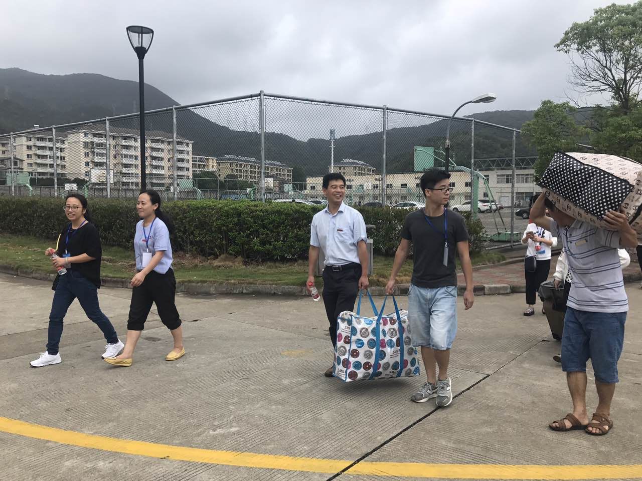 一行人步行在学校内前往新生寝室,一路上查看了定海新生的学习及生活条件,其间,虞书记还十分和蔼可亲地帮助新生搬行李。