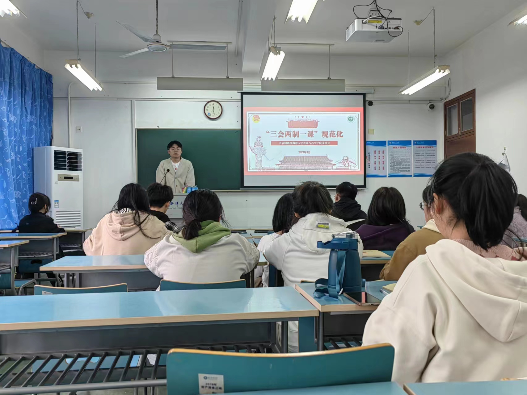 随后,吴老师强调了“三会两制一课”规范化工作。“三会两制一课”是联结班级团员的纽带,能够加强团员之间的联系,起到了重要的组织作用。因此,在组织团日主题活动时,班级团支部应注意活动的多样性和丰富性,更好地发挥“三会两制一课”的作用。