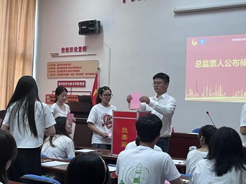 接着在吴老师的主持下代表们审议通过了《代表资格审查报告》等文件,了解了拟推荐参加校第七次团代会代表候选人和学院团委第三届团委委员候选人基本情况。随后,大会组织了代表们进行了公开透明的投票,为学院团委组织建设投下自己宝贵的一票。经过认真细致的机票环节,选举推荐徐延、马莹等18名代表参加校第七次团代会,选举吴宇、王佳琳等7名同志为学院第三届团委委员。