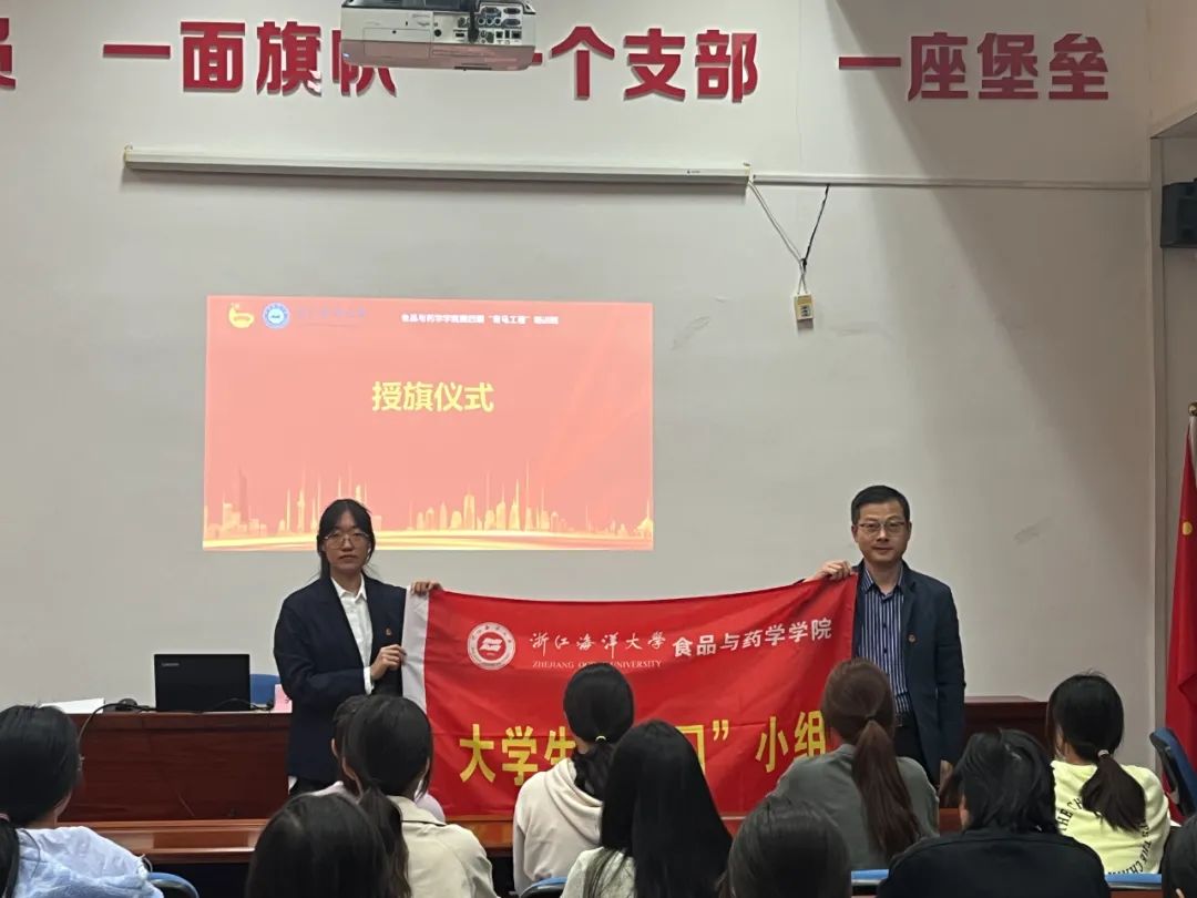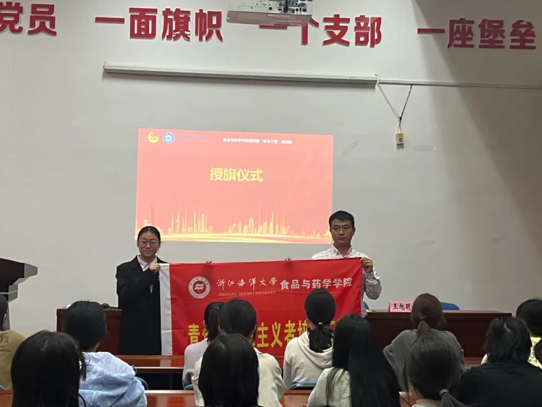 仪式最后,校团委副书记徐延老师为本期“青马工程”培训班授旗,学院第四期“青马工程”培训班班长何佳瑶同学接受旗帜;学院党委副书记、纪委书记王旭明老师为学院大学生学“习”小组授旗,学院团委学生副书记王宇馨接受旗帜。