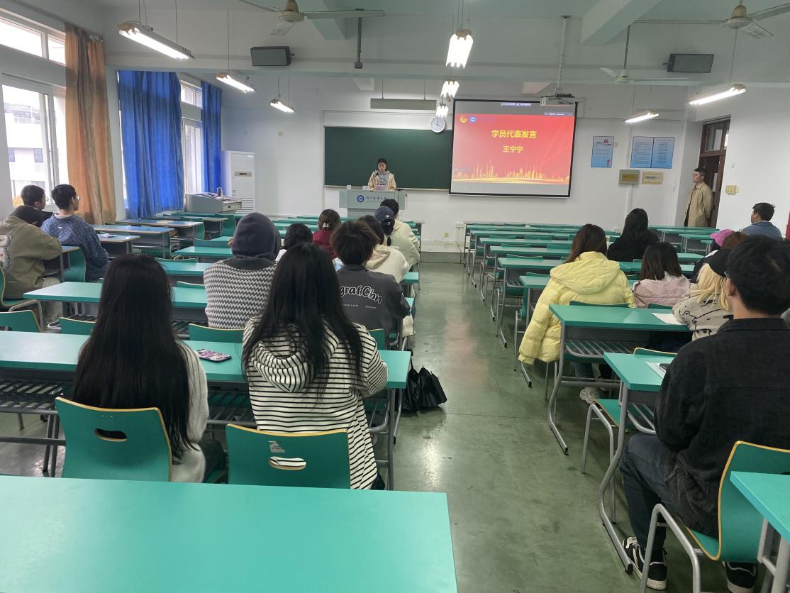 A22药学3班王宁宁同学作为学员代表发言。她呼吁全体学员树牢与新时代同心同向的理想信念,在培训中互促共进、追求卓越、锻炼成长,在学习和实践中奋斗开拓,做一名具有家国情怀的时代新人。